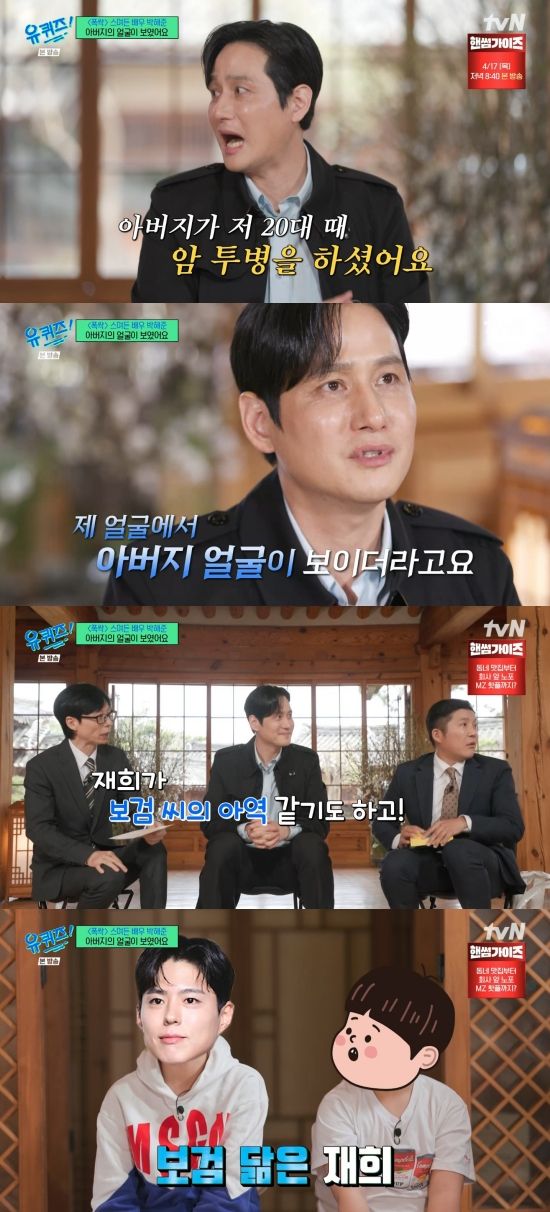 또 유재석은 "드라마 찍으면서 아버님 생각이 많이 나셨다고 한다"라며 물었다. 박해준은 "아버지가 사실 제가 20대 때 투병을 하셨다. 암이 있어서. 그래서 완전히 마르셨었다. 저도 촬영하면서 후반부에서 살을 빼는데 제 얼굴에서 아버지 얼굴이 나오더라. '내가 아버지랑 굉장히 닮은 사람이구나' 생각을 했던 거 같다"라며 전했다.