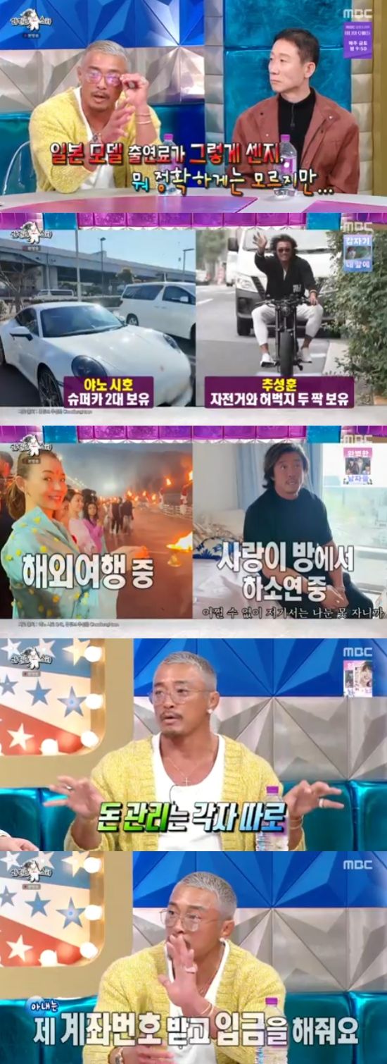 또 추성훈은 야노시호와 돈 관리를 각자 한다고 말했다. 추성훈은 "부의 중심이 아내다. 저보다 일도 훨씬 열심히 하고, 일본 모델 출연료가 얼마나 많은지 모르겠지만 슈퍼카도 2대가 있다"고 했다.