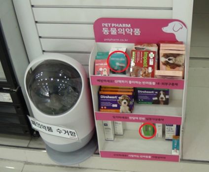 | ▲ 약국 내 유효기한이 경과한 동물용의약품을 진열하고 있는 판매대 |