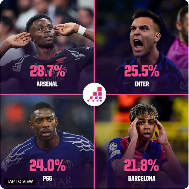4강이 결정된 후 축구 통계 업체 ‘OPTA’가 슈퍼컴퓨터 시뮬레이션으로 산출한 우승 확률은 팀간 큰 차이가 없다. 아스널이 28.7%, 인테르가 25.5%, PSG가 24%, 바르셀로나가 21.8% 순이다.