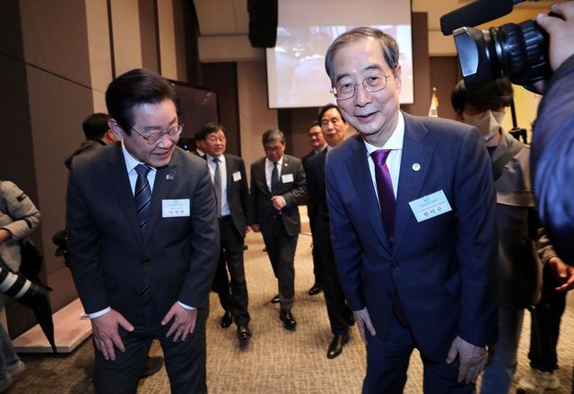 2023년 4월 6일 서울 중구 프레스센터에서 열린 제67회 신문의 날 기념식에서 한덕수 국무총리가 이재명 더불어민주당 대표와 인사를 나누고 있다. / 뉴스1