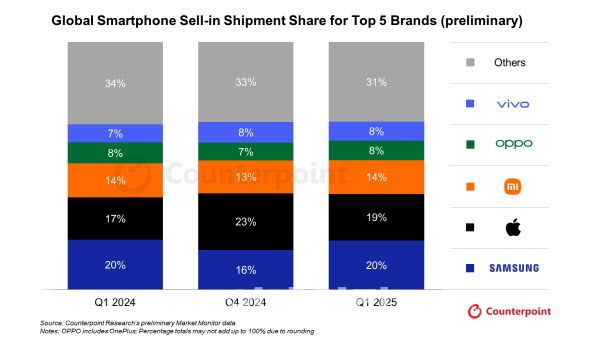 17일 시장조사업체 카운터포인트리서치에 따르면 2025년 1분기 삼성전자는 스마트폰 6100만대를 출하해 5800만대를 출하한 애플에 앞섰다. 이 기간 삼성전자의 시장점유율은 20%, 애플은 19%를 기록했다. 시장점유율 3위부터 5위는 모두 중국 제조사가 차지했다. 샤오미의 시장점유율은 14%를, 오포와 비보가 각 8%의 점유율로 4·5위에 이름을 올렸다.
