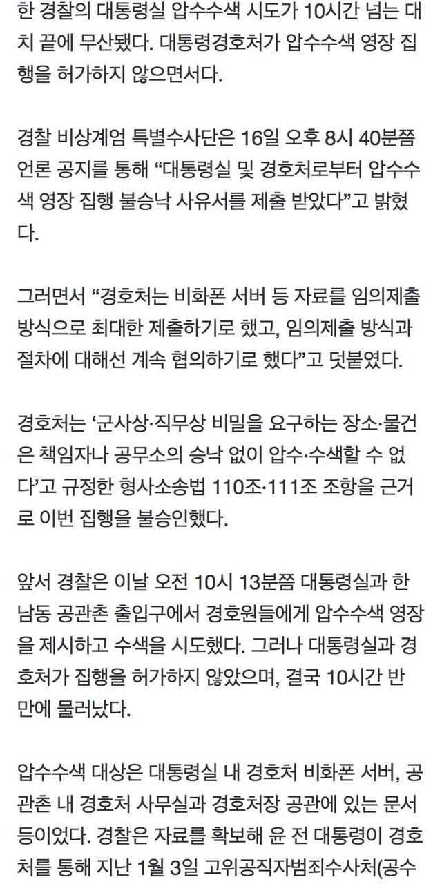 경찰, 경호처와 10시간 대치 끝 대통령실 압수수색 철수