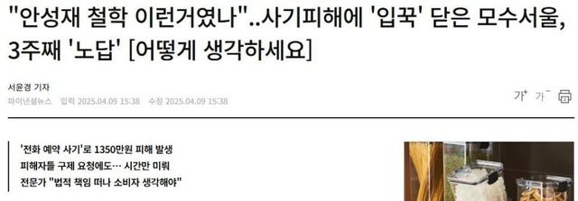 "안성재 철학 이런거였나"..사기피해에 '입꾹' 닫은 모수서울, 3주째 '노답' [어떻게 생각하세요] kt직원을 사칭한 피싱 사기꾼이 모수에 전화함근처 화재로 회선이 먹통 됐으니 착신전환 하라는 피싱 사기꾼 말에 모수 직원 이에 응함착신전환된 번호는 사기꾼에게 연결모수 전화 건 손님들은 착신전화 때문에 피싱 사기꾼에게 예약금 입금피해자 입장: 모수가 도의적 책임 져라 돈을 돌려주던지 예약대로 음식 주던지모수 입장: 우리도 피해자다 내부 논의 중========================================모수측 과실이 있으니 일단 모수에서 돈 돌려주고 사기꾼 잡아서 돈 받으면 될일 같은데요...