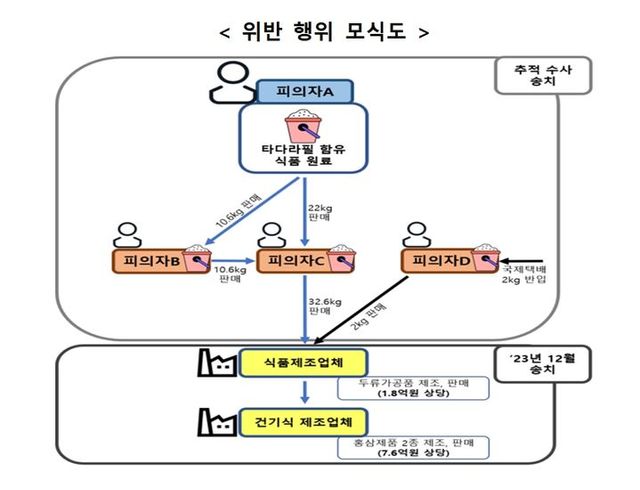 C씨는 A씨와 B씨로부터 구입한 타다라필 함유 식품 원료 32.6㎏(1억 5000만원 상당)을 2019년 1월부터 2022년 12월까지 식품제조업체에 판매해 '발아대두단백'을 제조하도록 하였다. 이 과정에서 D씨가 2020년 3월 타다라필 성분이 함유된 허브 분말 약 2㎏을 국제우편으로 반입해 ‘발아대두단백’에 사용하도록 식품제조업체에 판매한 사실도 확인됐다.