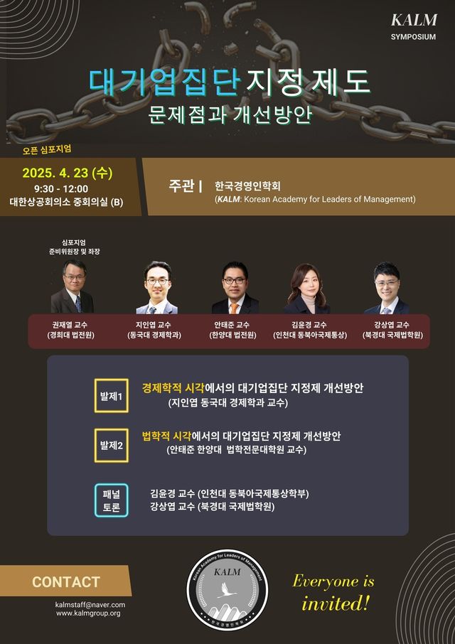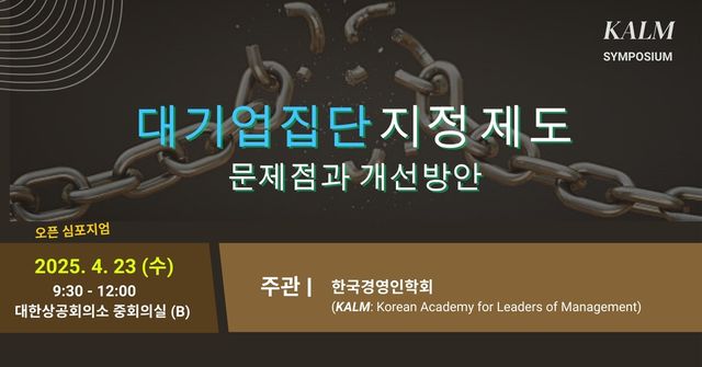 공정거래법상 대규모기업집단 지정 제도가 안고 있는 문제점을 경제학적, 법학적 관점에서 심층 조명한 학술 심포지엄이, 이달 23일 오전 한국경영인학회 주최로 서울 중구 대한상공회의소에서 열린다. 심포지엄 대주제는 ‘대기업집단 지정 제도 문제점과 개선 방안’이다.