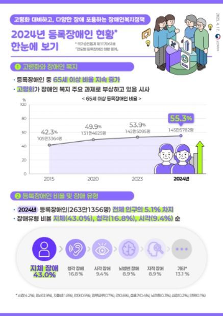 등록장애인 중 65세 이상의 비율은 꾸준히 증가하여 55.3%(1,455,782명)로 나타났다. 연령대별 비중은 60대(621,450명, 23.6%), 70대(578,655명, 22.0%), 80대(461,367명, 17.5%) 순이다.