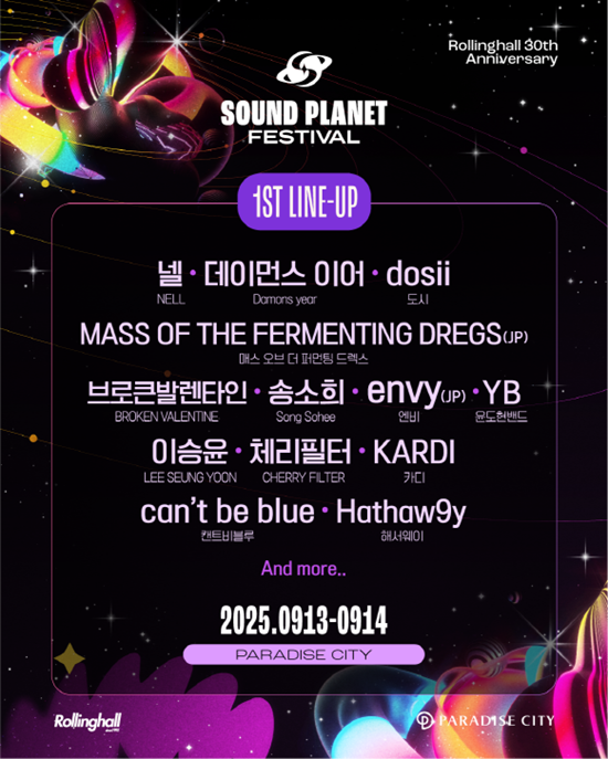 (엑스포츠뉴스 장인영 기자) 홍대 음악의 성지 롤링홀이 개관 30주년 기념하여 첫 대형 페스티벌인 ‘2025 사운드플래닛 페스티벌(2025 SOUND PLANET FESTIVAL)’이 YB, 체리필터, 넬, 이승윤 등이 포함된 1차 라인업을 전격 공개해 화제가 되고 있다.