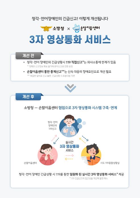 이러한 문제를 해결하기 위해 소방청과 과기정통부는 청각·언어 장애인이 119에 직접 신고할 수 있도록 손말이음센터와 119종합상황실 간 연계 시스템을 구축했다. 청각·언어장애인(신고자), 119 종합상황실, 수어통역사 간 3자 영상통화 시스템을 연계한 것이다.