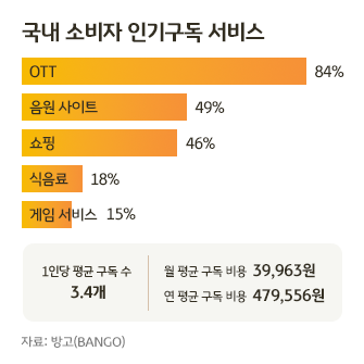 실제 서울시가 최근 구독경제 이용 실태조사를 한 결과, 2024년 구독경제 이용률은 전년 대비 3.8배 늘어났으며, 월평균 지출액은 40,530원인 것으로 나타났다. 구독서비스 이용자 가운데 95.9%가 하나 이상의 구독서비스를 이용 중인 것으로 나타났는데, 온라인동영상 ‘OTT 서비스’ 이용률이 90.1%로 가장 높았고, 쇼핑멤버십(83.8%), 음악 스트리밍(73.4%)이 뒤를 이었다.