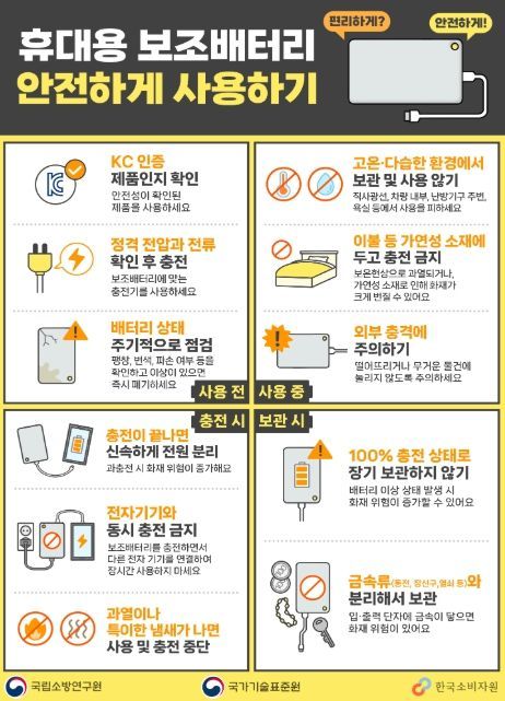 [와이뉴스] 산업통상자원부 국가기술표준원, 국립소방연구원 및 한국소비자원(원장 윤수현)은 일상생활의 필수품이 된 휴대용 보조배터리를 안전하게 사용하기 위한 수칙을 안내하는 홍보 캠페인을 실시한다.