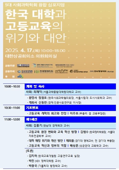 이번 학술 토론회(심포지엄)는 ‘한국 대학과 고등교육의 위기와 대안’을 주제로 열리며, 5대 사회과학 학회및 연구자, 정부기관 관계자 등 약 110여 명이 참석한다. 고등교육의 환경 변화, 대학재정 및 국제화, 지방대학의 역할과 과제 등 대학이 직면한 주요 이슈를 중심으로 논의가 진행될 예정이다.