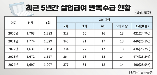 실업급여를 반복적으로 받은 사람이 매 년 늘고 있다. 고용노동부에 따르면 최근 5년간 실업급여를 2회 이상 반복적으로 받은 사람은 2020년 42만1000여명에서 지난해 49만여명으로 급증했다. 같은 기간 전체 실업급여 수급자 중 반복 수급자 비중 역시 24.7%에서 28.9%로 뛰었다. 물론 불가피하게 입·퇴사를 반복한 경우가 있긴 하지만 반대로 실업급여를 노리고 단기근무를 반복하는 경우도 상당수 포함돼 있을 것으로 짐작된다.