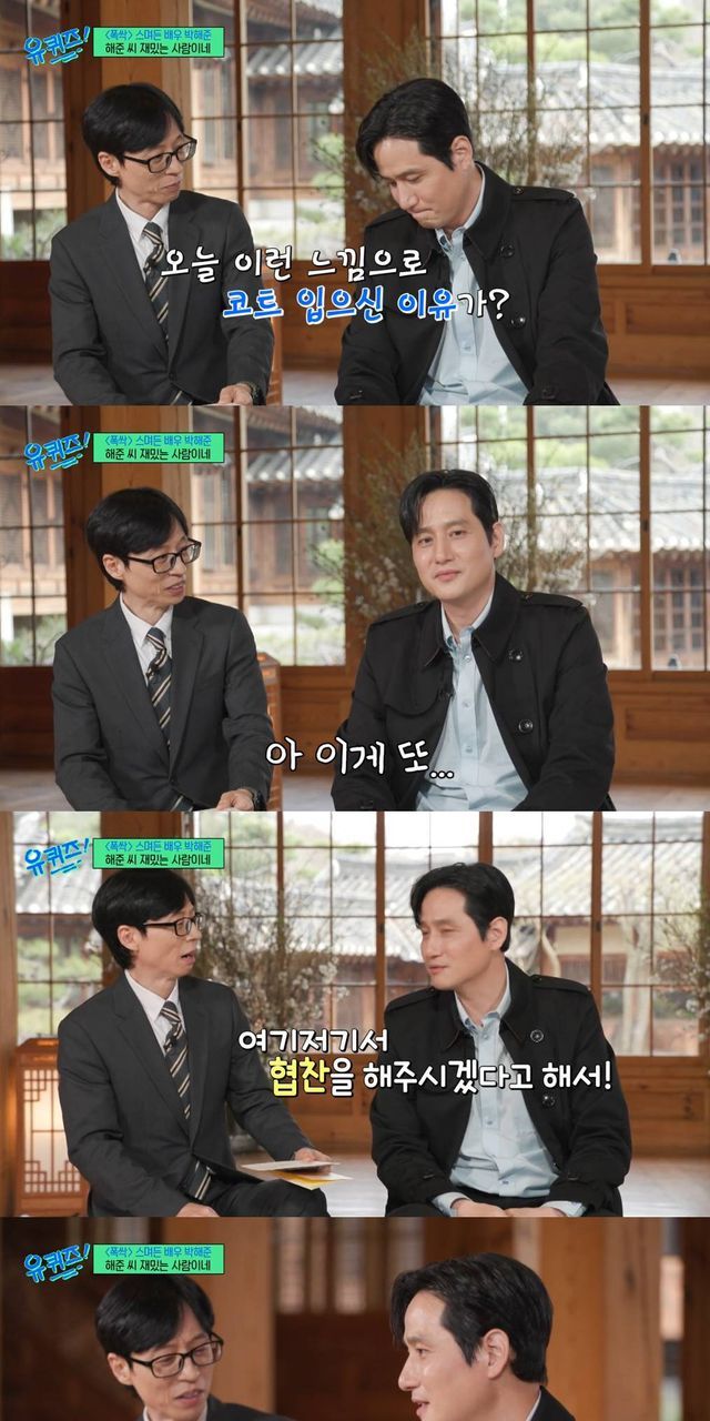 이날 방송에서 유재석은 박해준에게 "이런 느낌으로 오신 이유가 있냐"라며 트렌치코트를 언급했다.