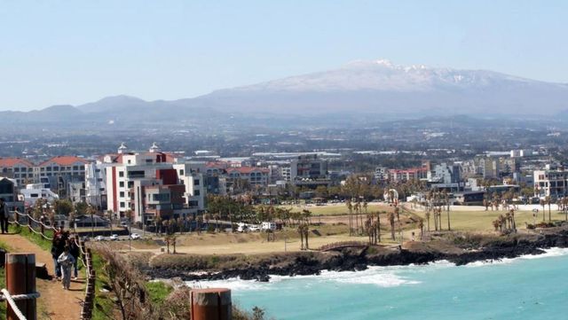 제주시 조천읍 서우봉에서 바라본 함덕해수욕장 뒤로 보이는 한라산. / 뉴스1