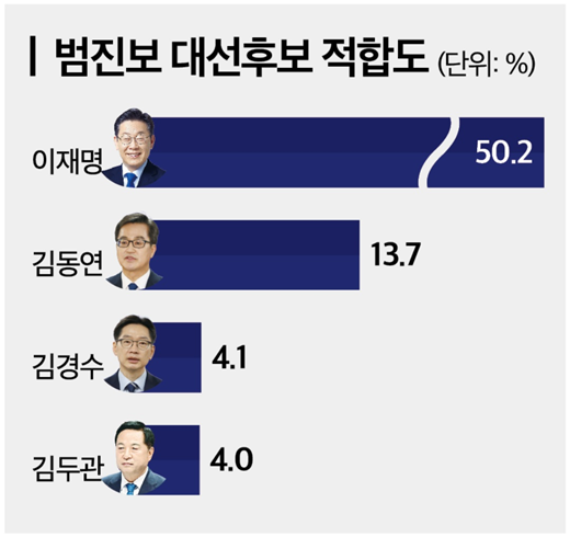 범진보 대선후보 적합도 조사에서는 이재명 전 당대표가 50.2%로 1위를 차지했고, 김동연 경기지사가 13.7%로 2위를 기록했다. 김경수 전 경남지사는 4.1%로 나타났다.