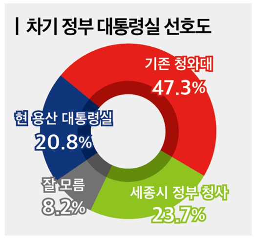 다음 정권에서 대통령 집무실을 어디로 둘 것인지에 대한 질문에서는 기존 청와대가 47.3%로 가장 높았고, 세종시 정부청사 23.7%, 현 용산 대통령실은 20.8%로 집계됐다.