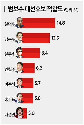 미디어토마토가 지난 14일부터 15일까지 이틀간 만 18세 이상 전국 성인 남녀 1,039명을 대상으로 실시한 여론조사에서 범보수 대선 후보 적합도를 묻는 질문에 한 대행의 지지율이 전체의 14.8%, 김문수 고용노동부 장관이 12.5%, 한동훈 전 당대표 8.4%의 지지율을 받았다.
