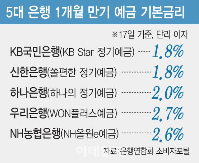 금융권 관계자는 “예금 금리가 더 낮아지는 건 시간문제다”며 “연말로 갈수록 현재 2% 중후반인 예금 금리(1년 만기)가 2% 초반까지 떨어질 수 있다”고 말했다.
