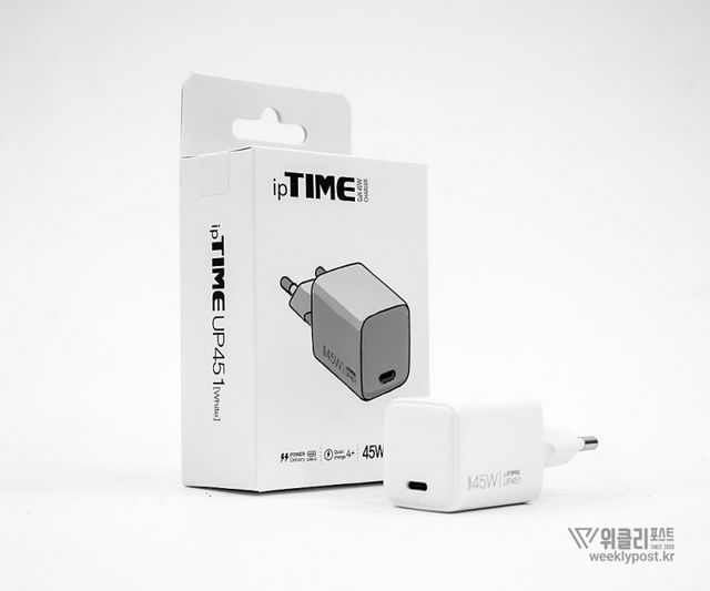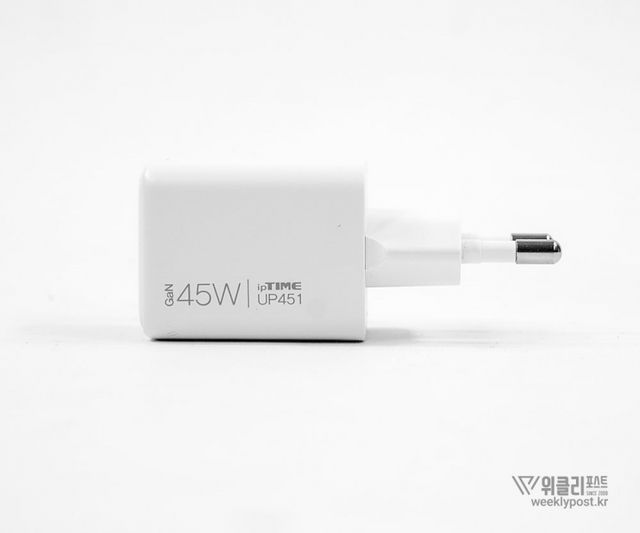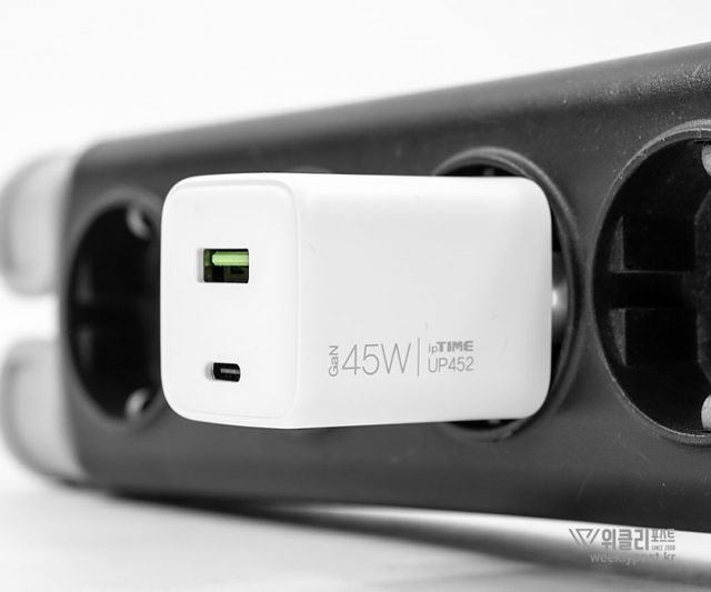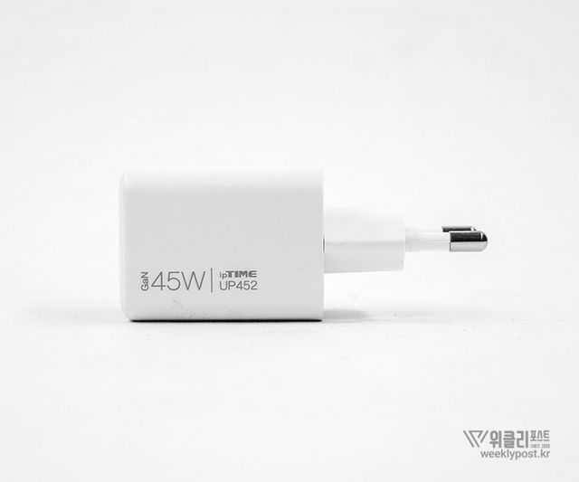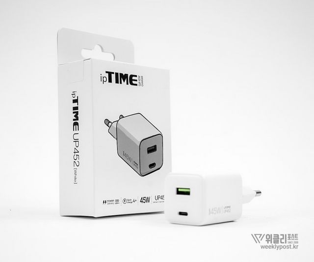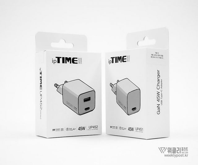 한쪽에는 콘센트에 꽂는 플러그가 있고 다른 쪽에는 USB와 연결하기 위한 USB 타입C 단자가 내장됐다. 아이피타임 UP451는 연결단자가 USB 타입C 1개이며, UP452은 일반 USB 타입A가 한 대 더 탑재되어 2개다. 측면에는 제품명이 마킹되어 있다. 꼭 필요한 기능을 갖춘 미니멀리즘 외관을 갖췄으며 성능에 비해 상당히 작은 크기다.