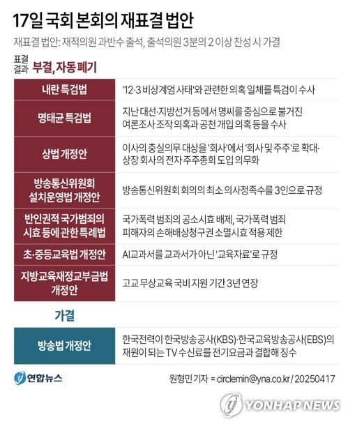 [폴리뉴스 김승훈 기자] 한덕수·최상목 대통령 권한대행이 거부권을 행사해 국회로 돌아온 상법 개정안과 내란·명태균 특검법 등이 17일 국회 본회의 재표결에서 국민의힘에서 일부 이탈표가 나왔으나 무더기로 부결되며 자동 폐기됐다. 다만, TV수신료를 전기요금에 통합 징수하도록 하는 방송법 개정안은 통과됐다.