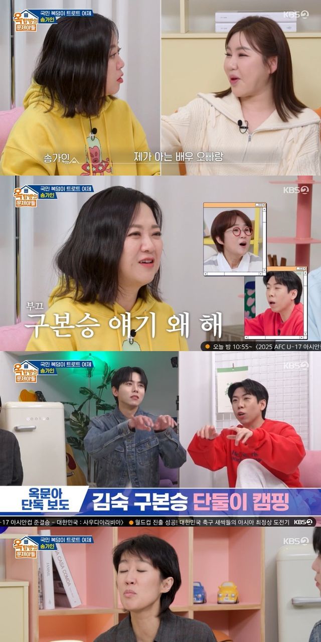 '옥문아' 멤버들이 운영하는 유튜브 채널 이야기를 나누던 중, 송가인은 캠핑 콘텐츠를 진행하는 김숙에 "진짜 거기 한번 가고 싶다. 아는 배우 오빠랑 항상 같이 촬영하더라"라고 말해 눈길을 끌었다.