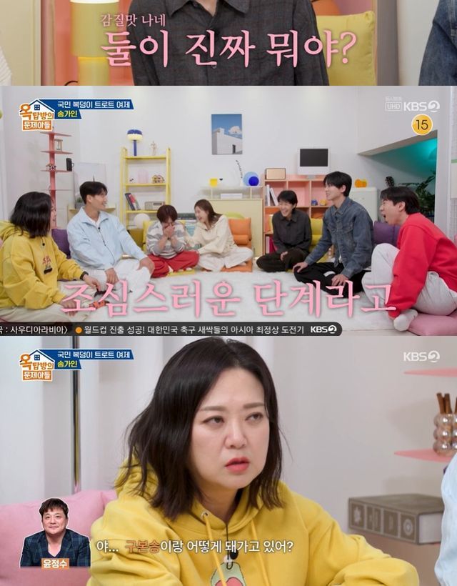 홍진경와 송은이도 "가만히 있다가 그러냐. 그건 좀 그렇다"며 거들었고, 송가인은 "진짜 좋은 소식 들리면 축가 부르러 가겠다"며 구본승과의 관계 진전을 응원했다.