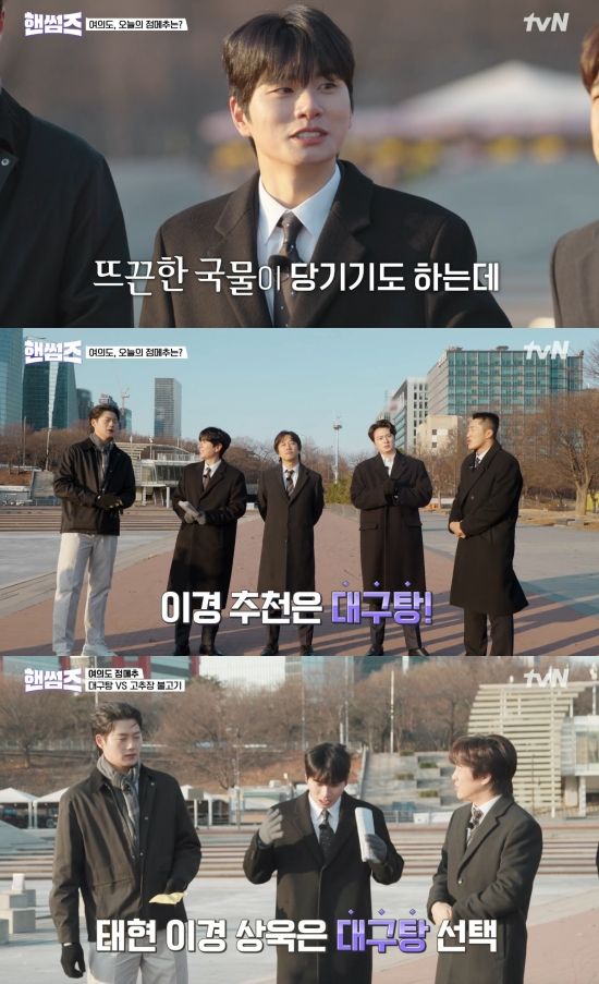 이이경은 "날씨가 아직 안 풀리지 않았냐. 춥다. 뜨끈한 국물. 전 추울 때는 대구탕"이라며 대구탕을 추천했고, 오상욱은 "맑은 거 좋다"라며 공감했다.