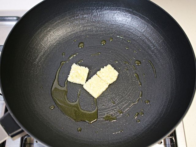 후라이팬에 식용유 한큰술, 다진마늘 넣어서