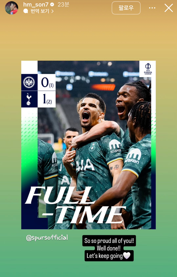 경기 후 주장 손흥민은 자신의 소셜미디어(SNS)를 통해 “동료들 모두 정말 정말 자랑스럽다! 정말 잘해줬다! 계속 나아가자”라며 선수들을 독려했다. 독일 원정에 함께하지는 못했지만 동료들을 독려하며 유로파리그 우승에 대한 의지를 보였다.
