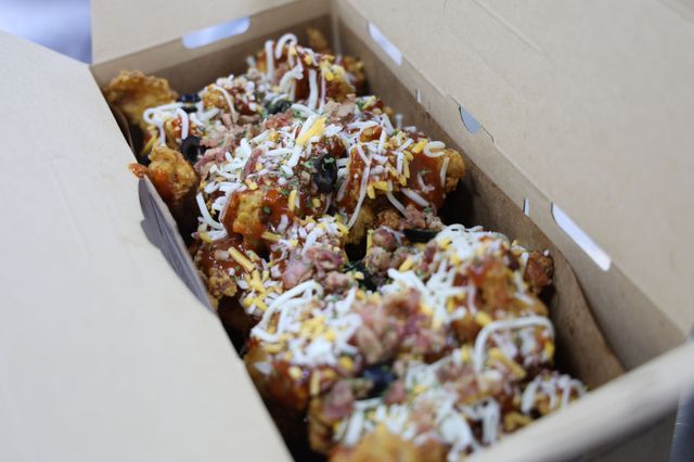 이후 포장 상자에 갓 튀겨진 치킨을 담고 그 위에 매콤한 맛의 피자풍 소스(300g)를 넉넉히 뿌리고, 모차렐라와 체다를 섞은 눈꽃 치즈(60g)를 더했다.