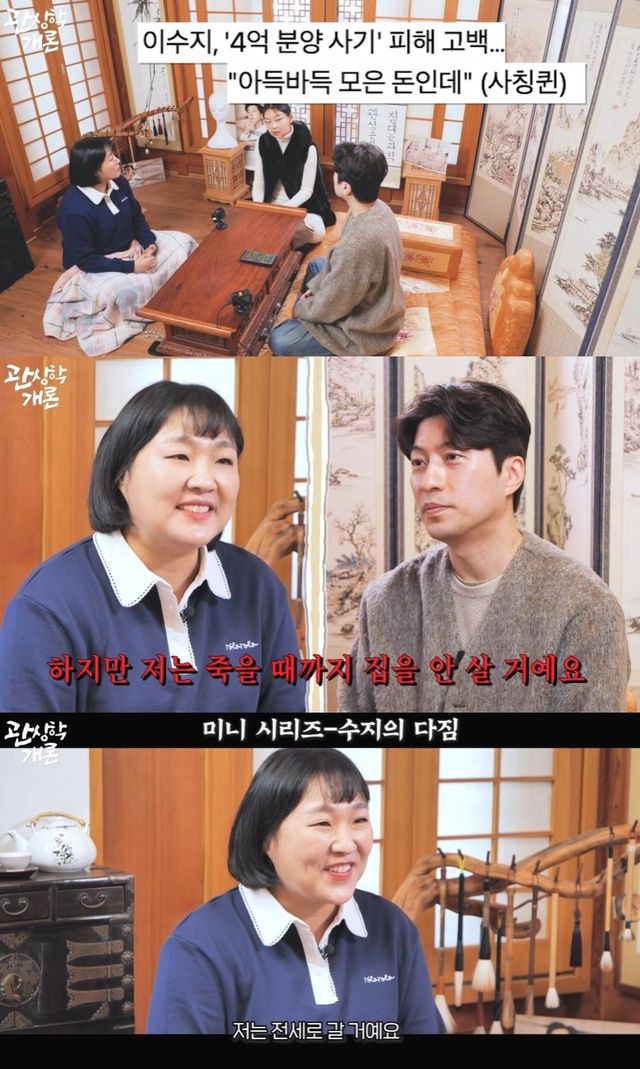 하지만 이수지는 "저는 죽을 때까지 집을 안 살 거다. 두 번 다시는 사기를 안 당하겠다. 나는 전세로 갈 것"이라며 트라우마를 드러냈다.