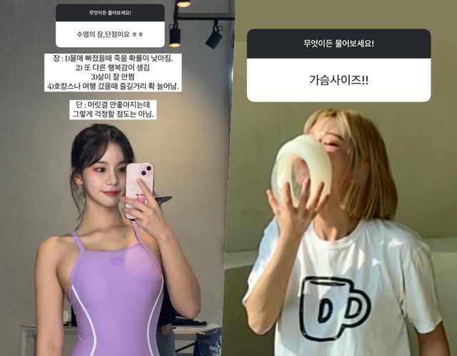 '수영의 장단점'을 묻자 그는 "물에 빠졌을 때 죽을 확률이 낮아짐, 또 다른 행복감이 생김, 살이 잘 안 찜, 호캉스나 여행 갔을 때 즐길 거리 확 늘어남"이라며 장점을 언급했고, 단점으로는 "머릿결이 안 좋아지는데 그렇게 걱정할 정도는 아님"이라고 말했다.