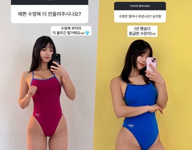 특히 맹승지는 이와 함께 묵직한 볼륨감을 뽐내는 수영복 자태를 공개했다. 맹승지는 수영은 얼마나 했냐는 질문에는 "1년 했습니다. 중급반 수린이!"라고 답했고, '예쁜 수영복 더 안 올려주시나요?'라는 질문에는 "수영복 부자라 더 올리긴 할거에요"라며 사진을 업로드했다.