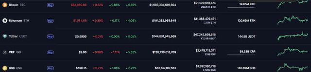 18일 글로벌 가상자산 시황중계 사이트 코인마켓캡에 따르면 이날 오전 8시 20분 기준 비트코인 가격은 24시간 전 대비 0.68% 오른 8만 4890달러를 기록했다. 일주일 전과 비교하면 6.85% 올랐다. 알트코인(비트코인 외 가상자산)의 대표격인 이더리움은 전일 대비 0.17% 상승한 1584달러에 거래됐으며, 리플(XRP)은 1.11% 하락한 2.06달러를 기록했다.