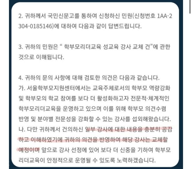 교육연수원이 공문을 보냈음에도 3개월이 지난 현재까지 일부 기관들이 수정 전 유의사항 안내문을 배부하는 데 대해 교육연수원은 "올해 처음 바뀌는 내용인 만큼 (강사 섭외) 담당자가 실수를 했을 것으로 보인다"고 했다. 그러면서 "연수원에서 좀 더 안내를 하겠다"며 시정 조치를 약속했다.