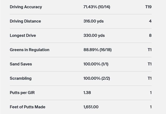 토마스는 드라이브 평균 거리 316야드, 최장타 330야드, 페어웨이 안착률 71.43%(10/14), 그린적중률 88.89%(16/18), 샌드세이브 100%(1/1), 스크램블링 100%(2/2), 홀당 평균 퍼트수 1.38개를 기록했다.