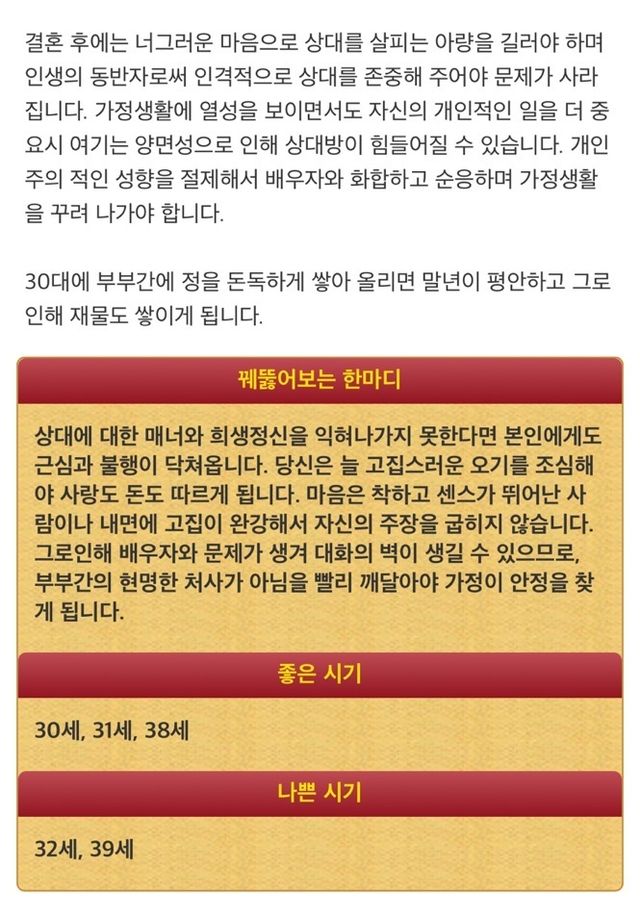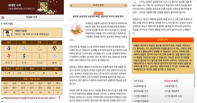 온라인 전문 사주 사이트 '위키사주'는 연인, 친구, 동료, 결혼지수와 성격, 재물운, 애정운, 배우자운, 철저한 궁합분석, 그리고 두 사람의 연애운을 상승시켜주는 부적까지 모두 다루고 있다. 더불어 오랜 전통을 바탕으로 한 사주팔자와 현대적인 분석 기술을 결합하여 각자의 운명을 상세히 분석하고 있는 위키사주는 이름과 생년월일, 태어난 시간과 성별을 입력하면 간단하게 이용할 수 있다.