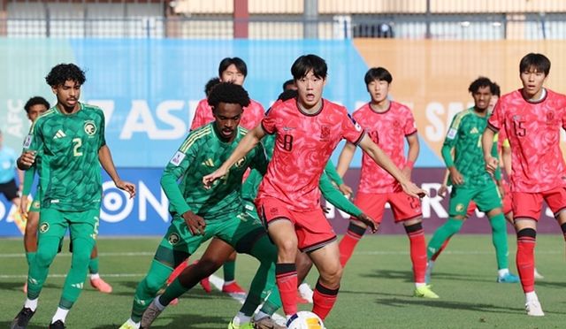 한국 사우디아라비아 경기 장면. 한국 U-17 축구대표팀은 이날 경기 전반 45분에 터진 오하람(광양제철고)의 선제골을 끝까지 지키지 못하고 사우디와 1-1로 비겼다. 이후 벌어진 승부차기에서 1-3으로 완패했다. 한국은 이번에 2002년 대회 이후 23년 만의 우승을 노렸으나 4강 고지에서 아쉽게 패해 아시안컵에서 탈락하고 말았다. / 대한축구협회 인스타그램