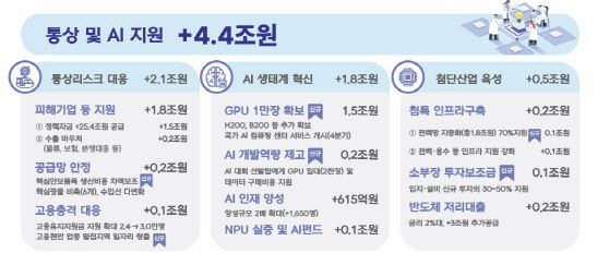통상·AI 부문은 총 4조 4000억원이 쓰인다. 구체적으로 △통상 리스크 대응(2조 1000억원) △국내 AI 생태계 혁신(1조 8000억원) △반도체 등 첨단전략산업 경쟁력 제고(5000억원) 등이다.