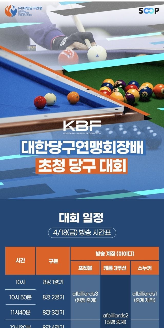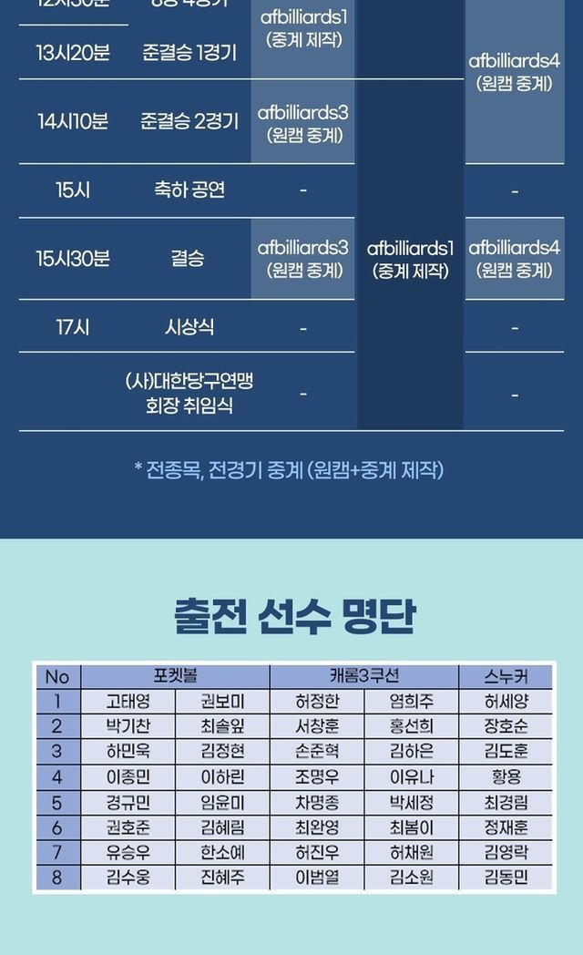 SOOP을 통해 실시간 생중계되는 이번 대회는 모든 종목 결승전이 낮 3시 반에 열리며, 이어 5시엔 대한당구연맹 제3대 서수길 회장 공식 취임식이 진행된다.