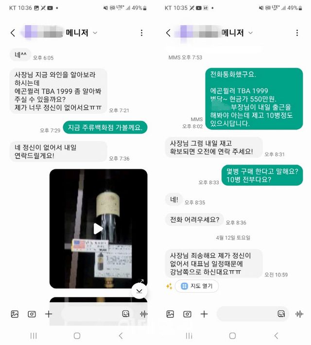 그런데 예약 조건이 조금 특이했다. 회식 때 한 병당 550만원 상당의 고가 와인을 10병가량 지인들에게 나눠주려 하니, 자신이 소개하는 와인업체 담당자를 통해 대신 구매해 주면 회식 후에 음식값과 함께 일괄 계산하겠다는 것이다.