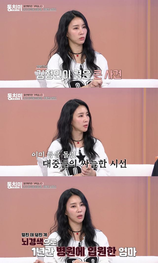 이날 김정민은 "내가 바닥을 쳤을 때 가족만 남았다"고 운을 뗀다. 그는 "전 남자친구와의 법적 분쟁이 종료되고 억울함이 밝혀졌지만, 그에게 사기·공갈 혐의로 고소를 당했다. 독립하고 일하면서 따로 잘 살다가 2017년에 힘든 일을 겪게 됐다. 벌써 8년이나 됐다"며 과거 힘들었던 순간을 떠올린다.
