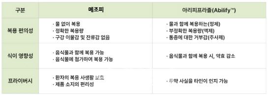 특히 오핍자는 CMG제약의 특허를 회피하기 위해 피부 및 구강 점막에 자극성이 있고 제조 공정상 물과 접촉했을 때 다량의 기포가 발생하는 분말형 계면활성제를 사용한 것으로 알려져 있다는 것이 회사측 설명이다. CMG제약 관계자는 “메조피는 자극성이 적고 복용편의성을 고려한 첨가제 설계를 통해 필름의 물성 및 외관과 복용순응도를 동시에 확보했다. 이 때문에 오핍자는 물성 안정성과 환자만족도 측면에서 메조피보다 불리할 것으로 예상하고 있다”며 “메조피는 기존 정제 기반 아리피프라졸 의약품의 용량 범위에 맞춰 15㎎ 고용량 제품이 있고, 앞으로 2㎎ 용량의 소아용 제품도 개발할 예정이라 다양한 연령층, 적응증에 따른 맞춤형 투약도 가능하다”고 말했다. 현재 오핍자는 2㎎, 5㎎, 10㎎ 용량으로 허가를 받은 상태다.