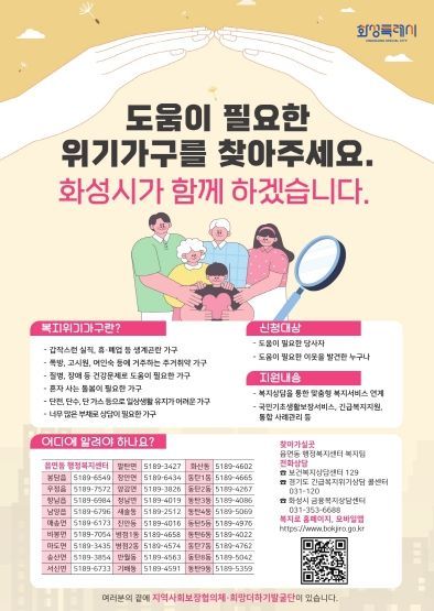 [와이뉴스] 화성특례시는 복지사각지대에 놓인 위기가구를 조기에 발굴하고 지원하기 위해 시민 참여를 유도하는 홍보 포스터를 제작·배포하며 복지안전망 강화에 나섰다.