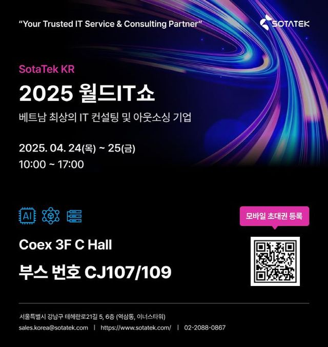 SotaTek은 COEX 3층 C홀 부스 번호 CJ107/109에 마련된 전시 공간에서 △AI 기반 자동화 시스템 △스마트 업무 관리 및 협업 솔루션 △보안성과 확장성을 갖춘 스토리지 및 파일 관리 서비스 등을 소개할 예정이다. 이와 함께 한국 시장을 위한 IT 아웃소싱 및 디지털 컨설팅 서비스도 선보일 계획이다.
