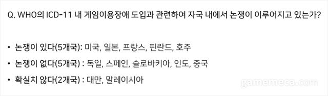 아울러 게임 질병코드 도입에 관련한 12개국 의견과 자국 분위기는 모두 달랐다. 우선 질병코드 도입에 대해 자국 내에서 논쟁이 이뤄지는가에 대한 질문에 대해 미국·일본·프랑스·핀란드·호주는 ‘논쟁이 있다’고 답변했다. 이어서 독일·스페인·슬로바키아·인도·중국은 논쟁이 없다고 밝혔다. 진 교수는 “스페인에서는 발표 며칠 뒤에 사회적 관심이 빠르게 사라졌다”라며 “중국은 도입을 위해 적극적으로 로비를 하고 있는 입장이다”라고 설명했다.