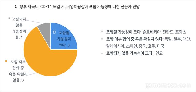 WHO의 ICD-11를 도입할 때 게임 이용장애도 포함될 가능성에 대해서는 슬로바키아·핀란드·프랑스는 가능성이 높다고 예상했다. 독일·일본·대만·미국 등 8개국은 협의 중이거나 확실치 않다고 내다봤다. 인도는 질병으로 분류한 것을 긍정적으로 평가했음에도 적용되지 않을 가능성이 크다는 이례적인 답변을 냈다. 진예원 교수 역시 조사 대상 국가 수가 제한적이었고, 전문가 개인 의견에 기반한 탐색적인 조사였기에 객관성과 대표성을 좀 더 보강할 필요가 있다고 설명했다.
