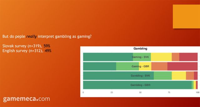 여기에 카흘리니 교수는 영어를 사용하는 사람과 슬로바키아어를 사용하는 사람을 각각 300명 이상을 모아 설문조사를 한 결과 슬로바키아어는 59%, 영어는 49%가 ‘도박도 게임에 포함된다’고 답변했다고 소개했다. 항목별로 살펴봐도 실제 현금을 쓰는 온라인 포커에 대해서도 ‘게이밍’에 해당한다고 답한 응답자가 적지 않다.