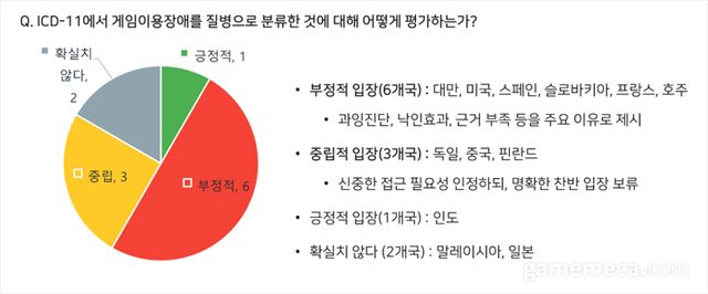 이어서 WHO가 게임 이용장애를 질병으로 분류한 것에 대해서는 대만·미국·스페인·슬로바키아·프랑스·호주가 ‘부정적’이라 답했다. 이어서 독일·중국·핀란드는 중립적, 인도는 긍정적이라 답변했다. 진 교수는 “공통적으로는 모든 전문가가 이야기하는 부분은 게임 이용장애 진단에 대한 과학적 근거가 부족하다는 점이다. 개념의 모호성, 광범위성, 오용, 부작용에 대한 우려가 공통적으로 제기됐다”라고 밝혔다.